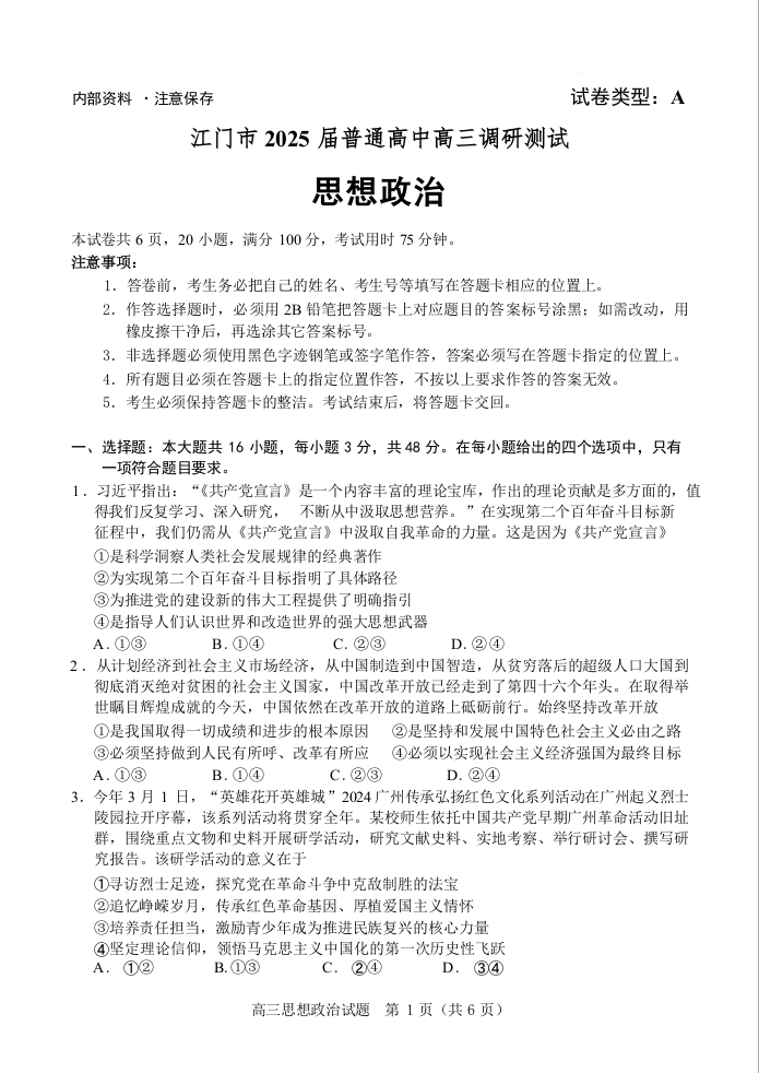 广东省江门市2025届高三上学期10月调研考试政治