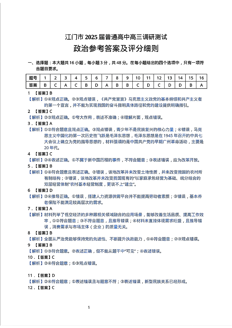 广东省江门市2025届高三上学期10月调研考试政治答案