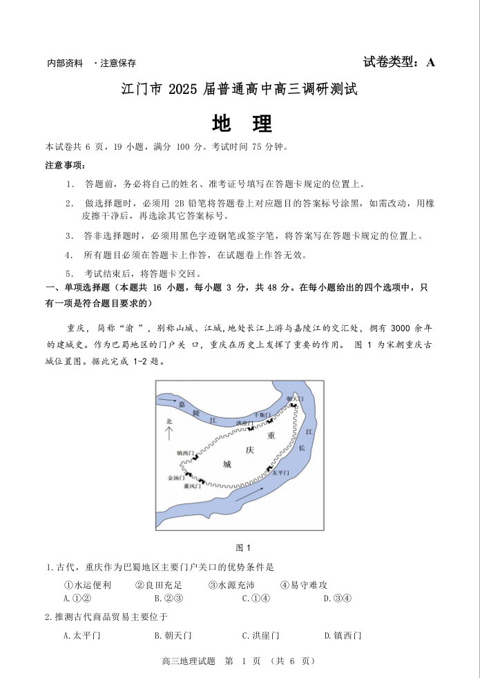 广东省江门市2025届高三上学期10月调研考试地理+答案