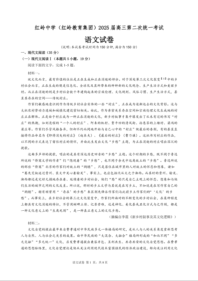 广东省深圳市福田区红岭中学2025届高三上学期第二次统一考试语文