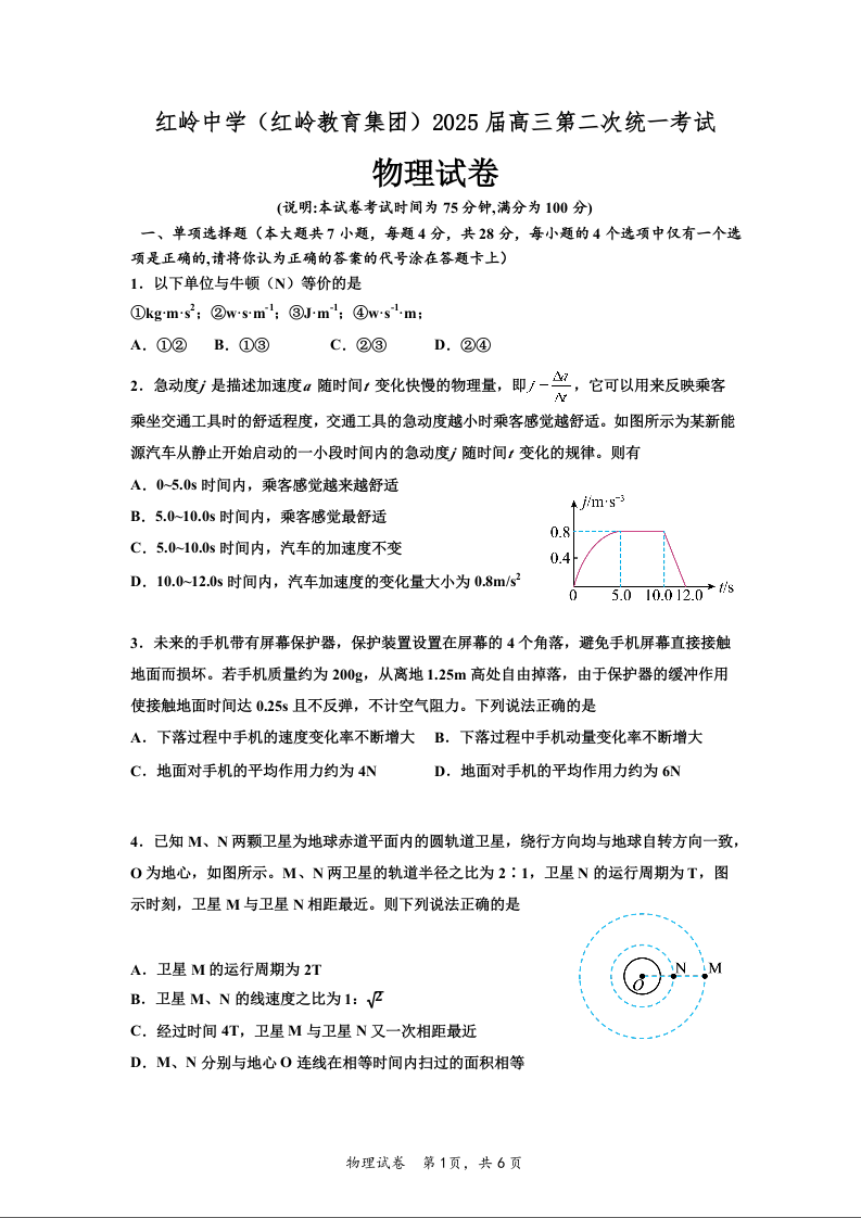 广东省深圳市福田区红岭中学2025届高三上学期第二次统一考试物理