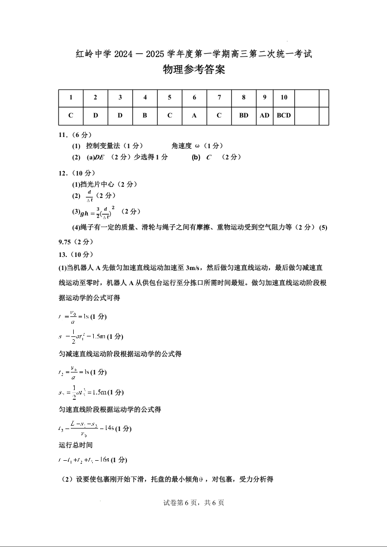 广东省深圳市福田区红岭中学2025届高三上学期第二次统一考试物理答案