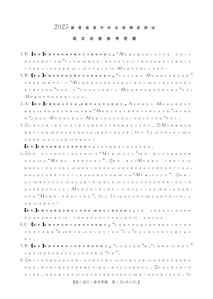 广西省南宁市七市联考2025届普通高中毕业班高三摸底测试语文答案
