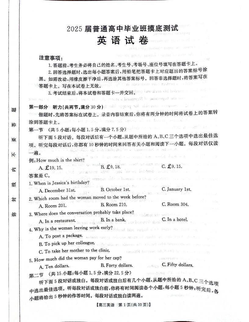 广西省南宁市七市联考2025届普通高中毕业班高三摸底测试英语