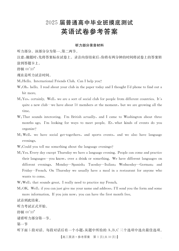 广西省南宁市七市联考2025届普通高中毕业班高三摸底测试英语答案