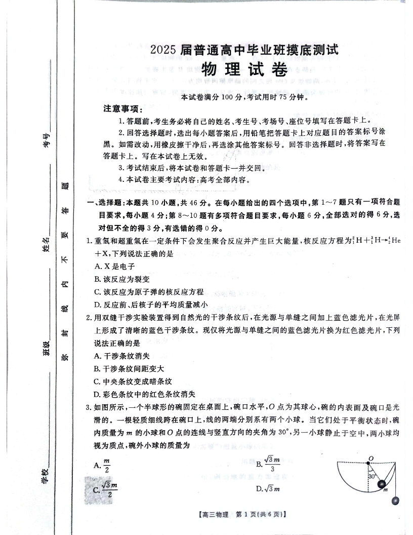 广西省南宁市七市联考2025届普通高中毕业班高三摸底测试物理