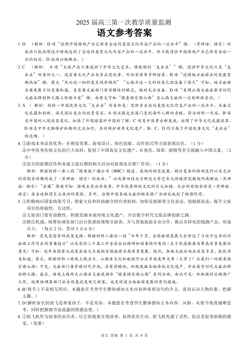 广西省玉林市2025届高三上学期第一次教学质量监测语文答案