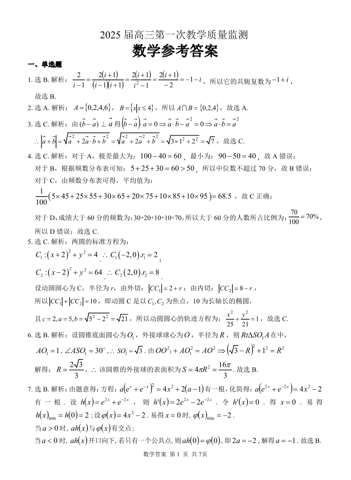 广西省玉林市2025届高三上学期第一次教学质量监测数学答案