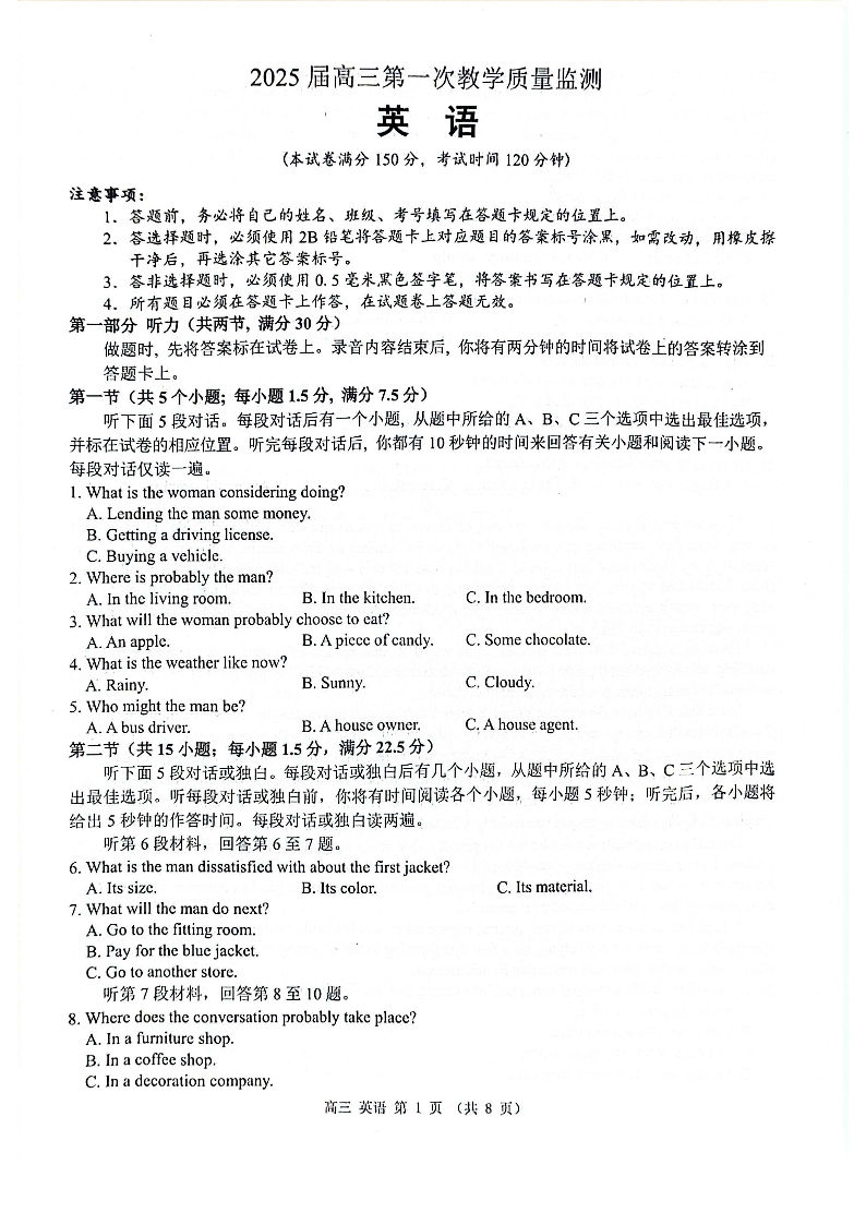 广西省玉林市2025届高三上学期第一次教学质量监测英语