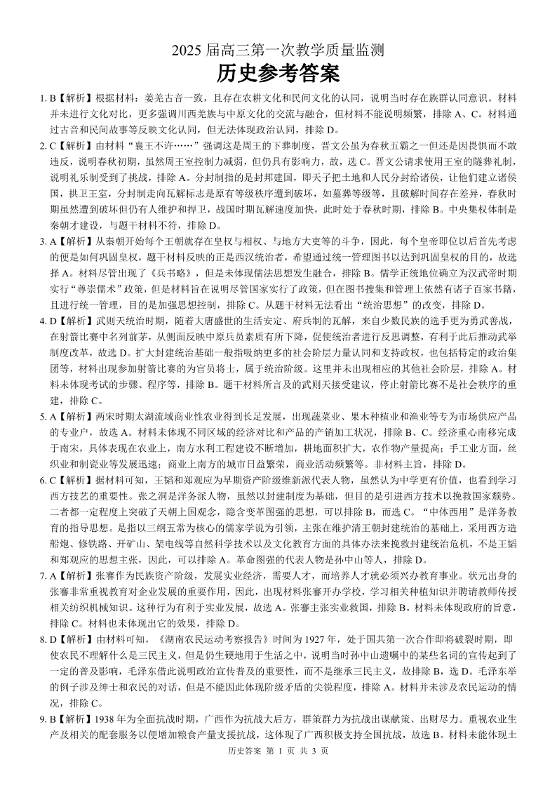 广西省玉林市2025届高三上学期第一次教学质量监测历史答案