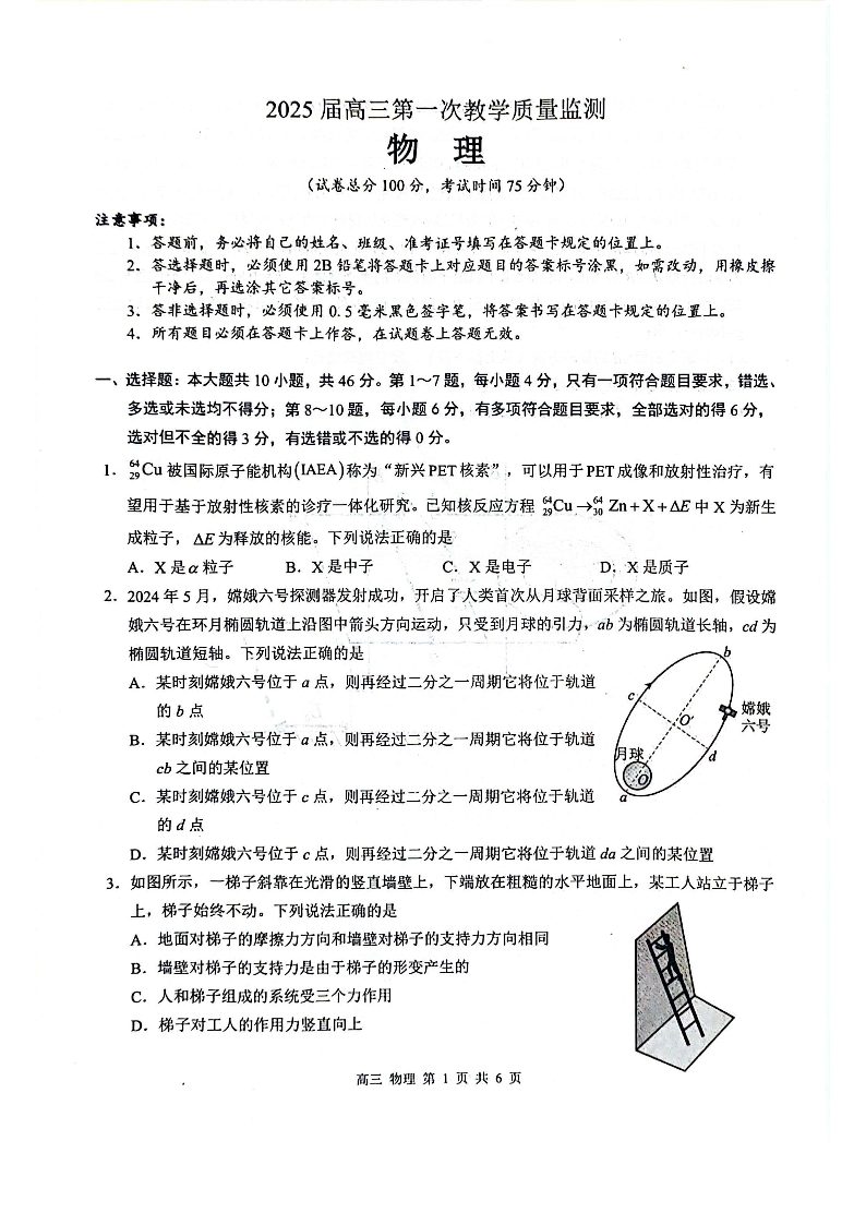 广西省玉林市2025届高三上学期第一次教学质量监测物理