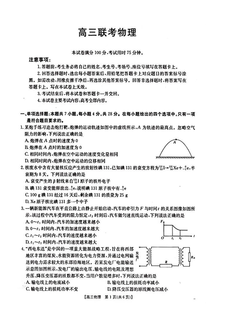 贵州省部分高中2025届高三上学期10月联考物理+答案