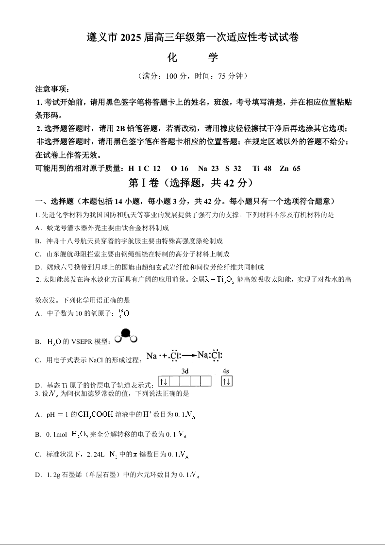 贵州省遵义市2025届高三上学期第一次适应性考试(一模)化学