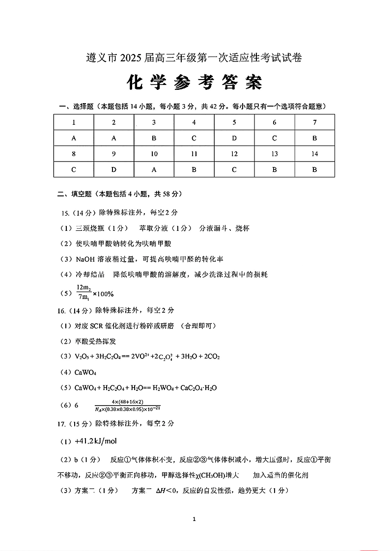 贵州省遵义市2025届高三上学期第一次适应性考试(一模)化学答案