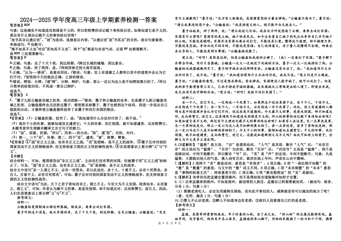 河北省衡水市第二中学2025届高三上学期素养检测(一)语文答案