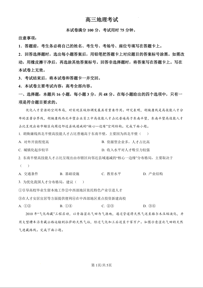 河北省衡水市第二中学2025届高三上学期素养检测(一)地理试题(原卷版)