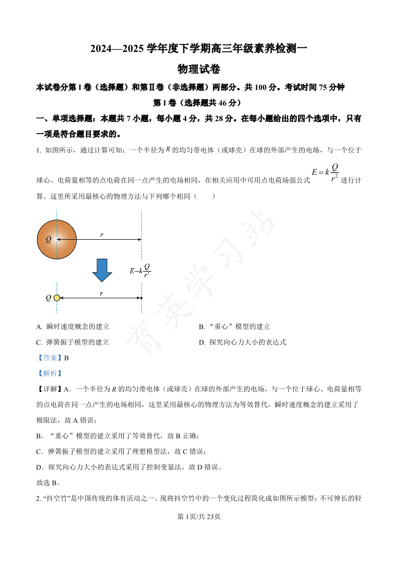 河北省衡水市第二中学2025届高三上学期素养检测(一)物理答案