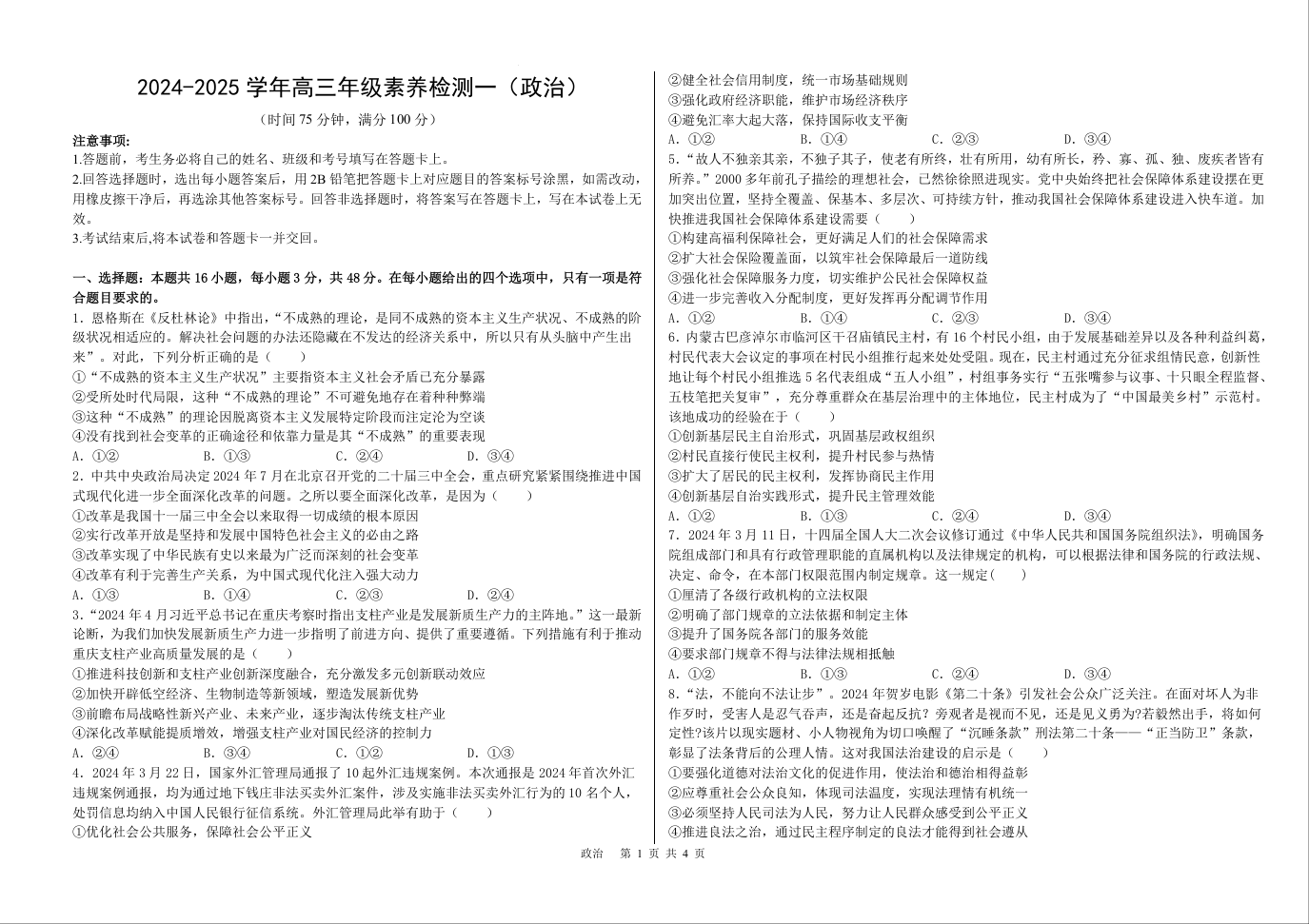 河北省衡水市第二中学2025届高三上学期素养检测(一)政治