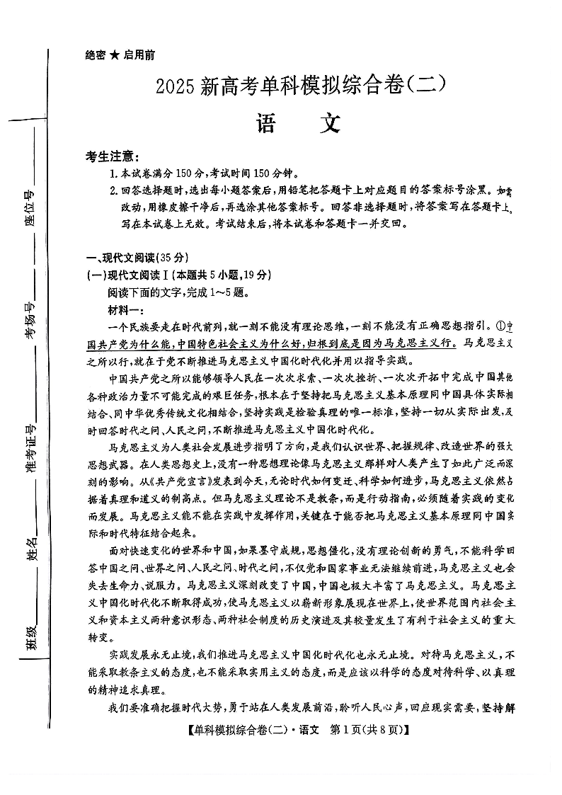 河北省2025届高三上学期新高考单科模拟综合卷(二)语文