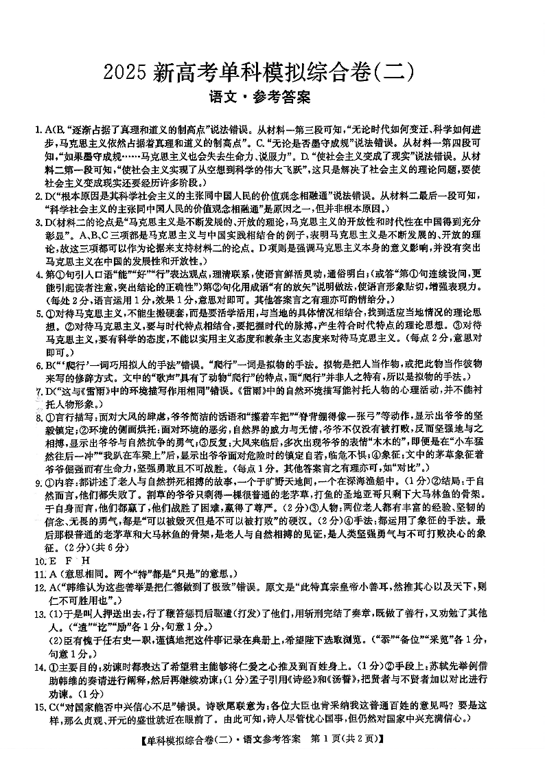 河北省2025届高三上学期新高考单科模拟综合卷(二)语文答案