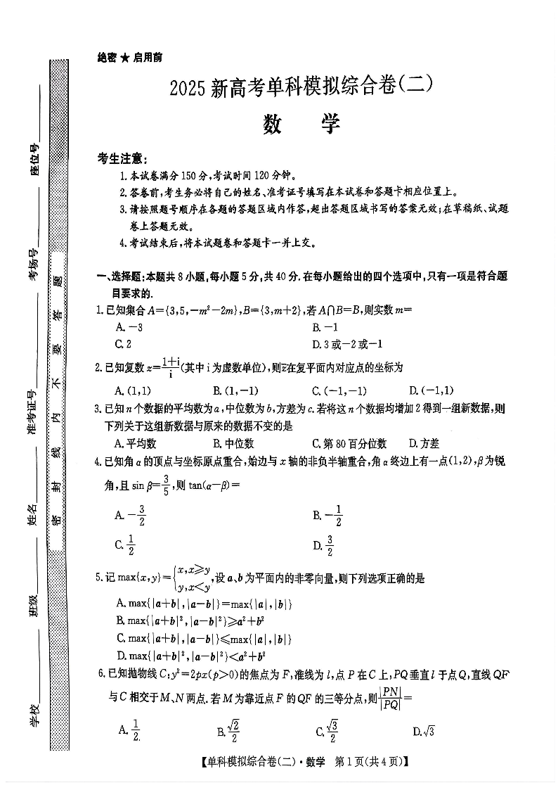 河北省2025届高三上学期新高考单科模拟综合卷(二)数学