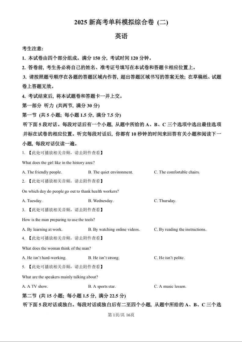 河北省2025届高三上学期新高考单科模拟综合卷(二)英语+答案