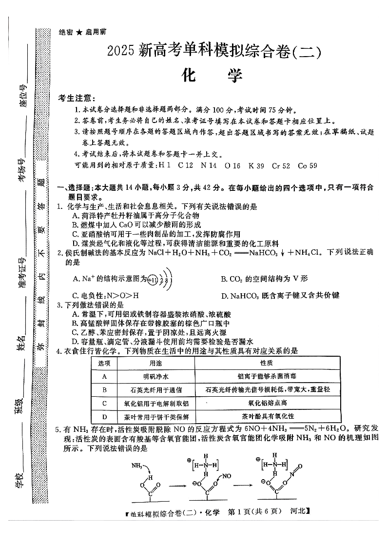 河北省2025届高三上学期新高考单科模拟综合卷(二)化学