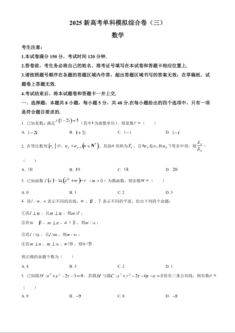 河北省2025届高三上学期新高考单科模拟综合卷(三)数学+答案