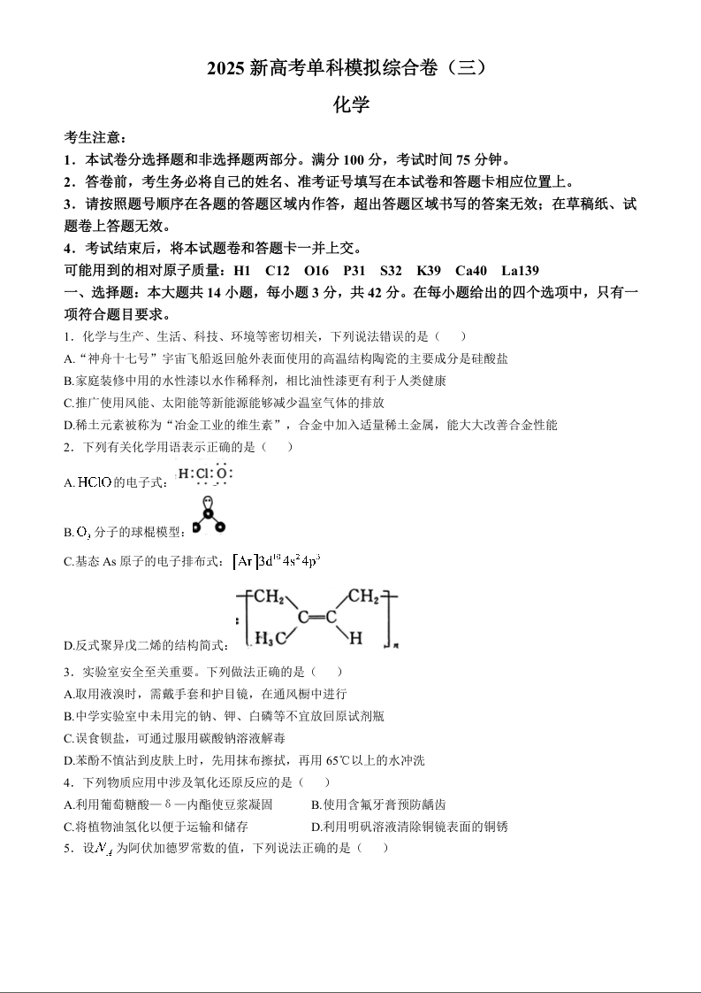 河北省2025届高三上学期新高考单科模拟综合卷(三)化学+解析