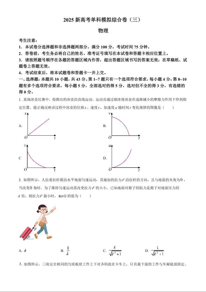河北省2025届高三上学期新高考单科模拟综合卷(三)物理+答案