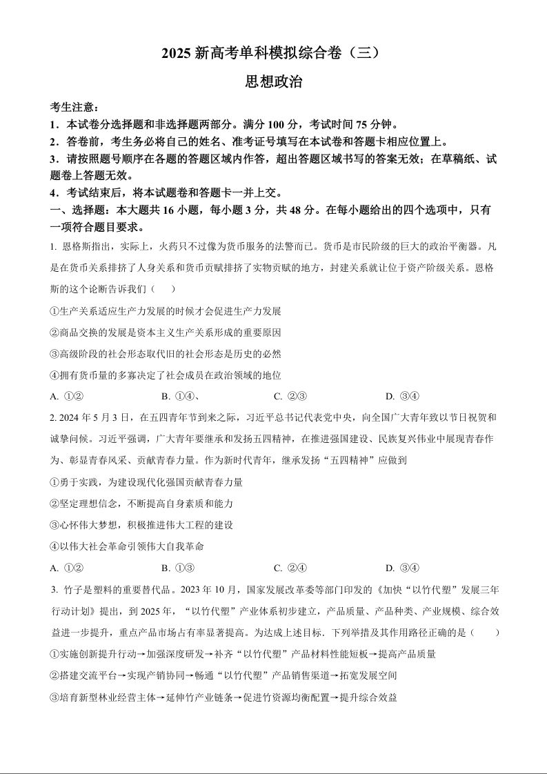 河北省2025届高三上学期新高考单科模拟综合卷(三)政治+答案