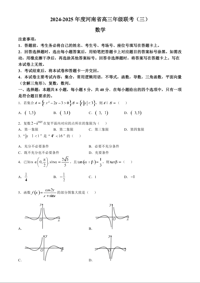 河南省部分高中2024-2025年高三年级联考(三)数学