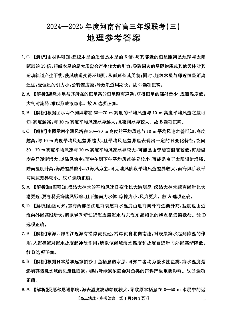 河南省部分高中2024-2025年高三年级联考(三)地理答案