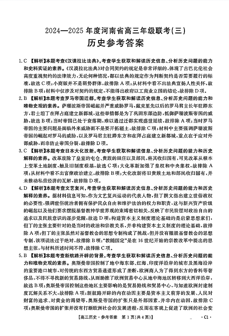 河南省部分高中2024-2025年高三年级联考(三)历史答案