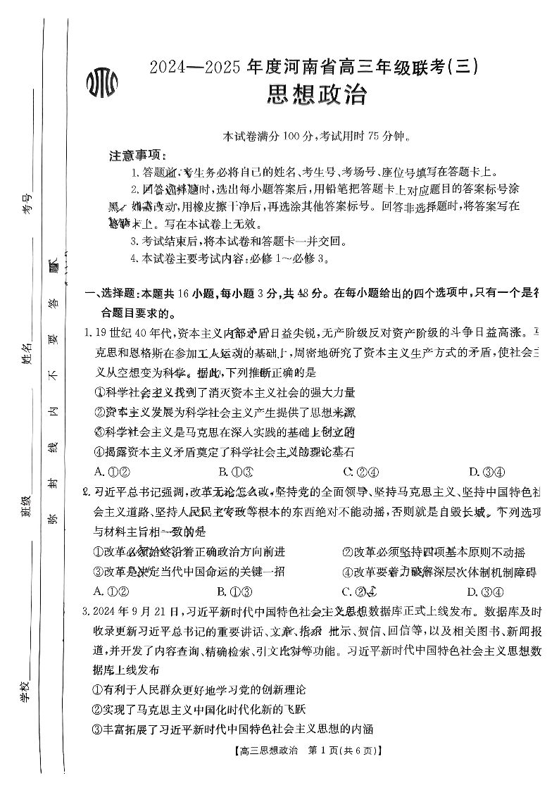 河南省部分高中2024-2025年高三年级联考(三)思想政治