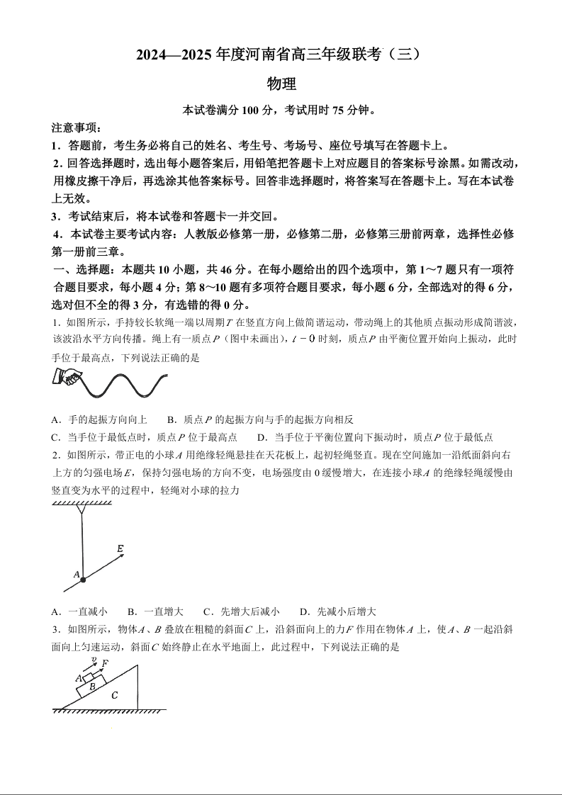 河南省部分高中2024-2025年高三年级联考(三)物理+答案