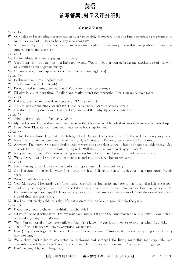 河南省新高中创新联盟TOP二十名校2025届高三上学期10月调研考试(一)英语答案