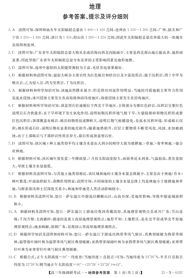 河南省新高中创新联盟TOP二十名校2025届高三上学期10月调研考试(一)地理答案