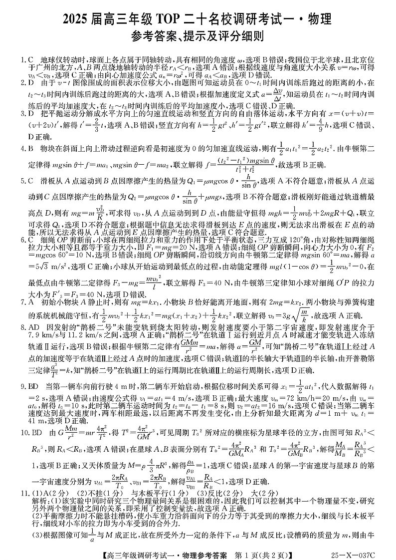 河南省新高中创新联盟TOP二十名校2025届高三上学期10月调研考试(一)物理答案