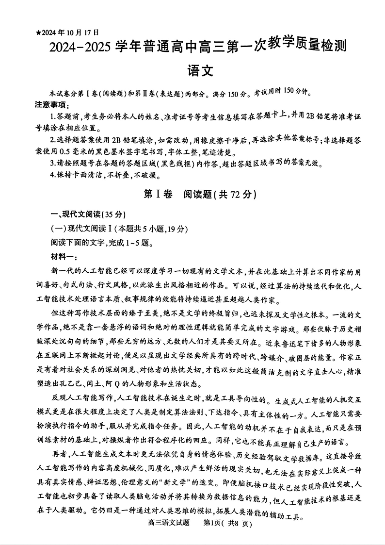 河南省信阳市2024-2025学年普通高中高三第一次教学教学质量检测 语文
