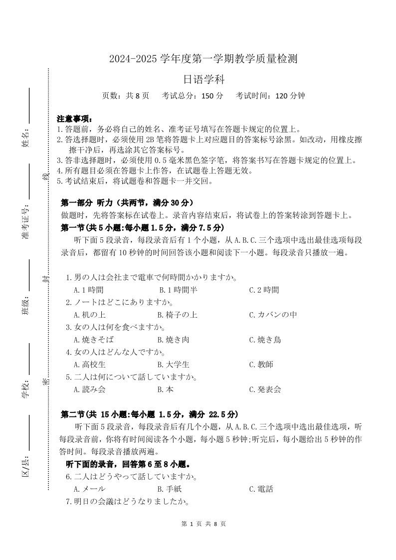 河南省信阳市2024-2025学年普通高中高三第一次教学教学质量检测 日语