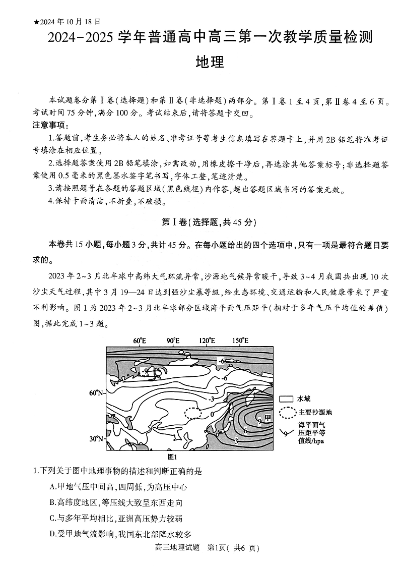 河南省信阳市2024-2025学年普通高中高三第一次教学教学质量检测 地理