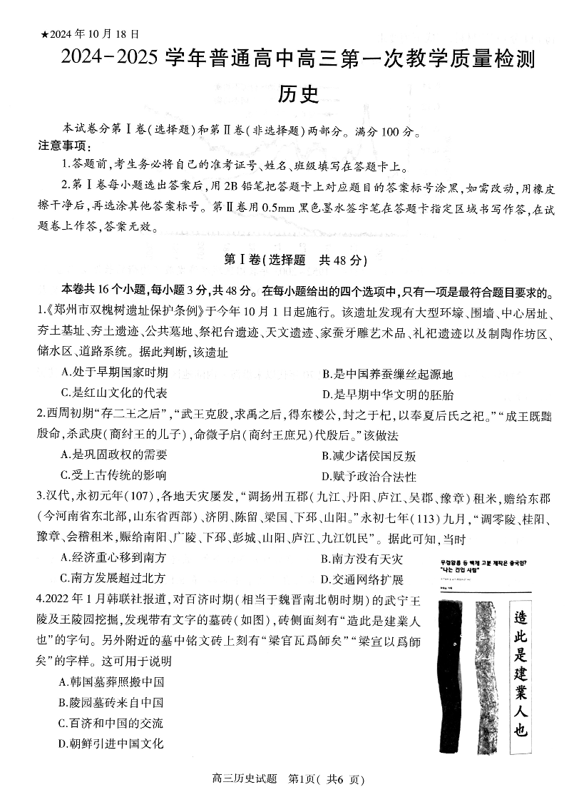 河南省信阳市2024-2025学年普通高中高三第一次教学教学质量检测 历史