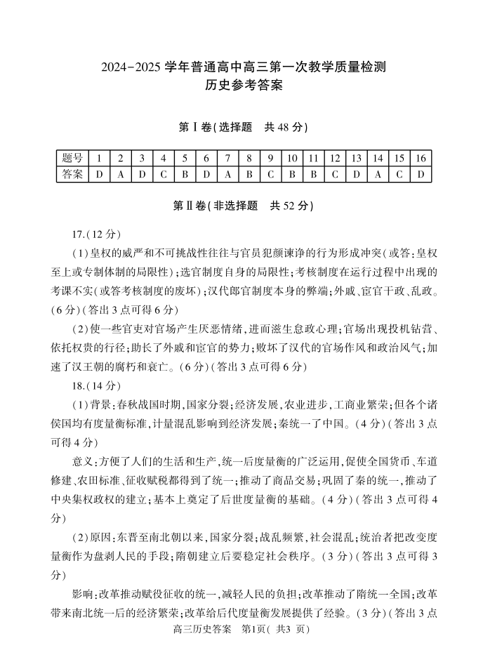 河南省信阳市2024-2025学年普通高中高三第一次教学教学质量检测 历史答案