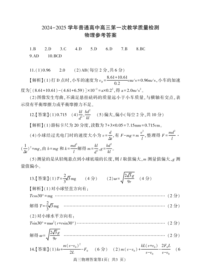河南省信阳市2024-2025学年普通高中高三第一次教学教学质量检测 物理答案