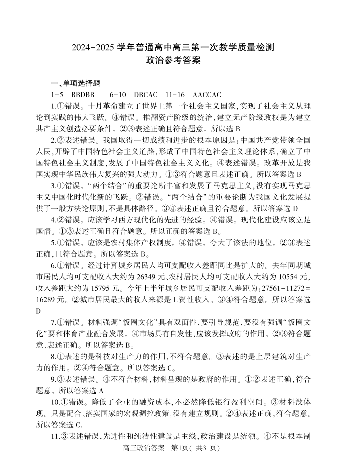 河南省信阳市2024-2025学年普通高中高三第一次教学教学质量检测 政治答案