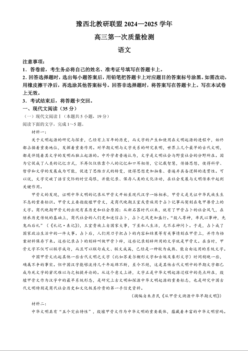 河南省豫西北教研联盟2025届高三上学期第一次质量检测语文+答案