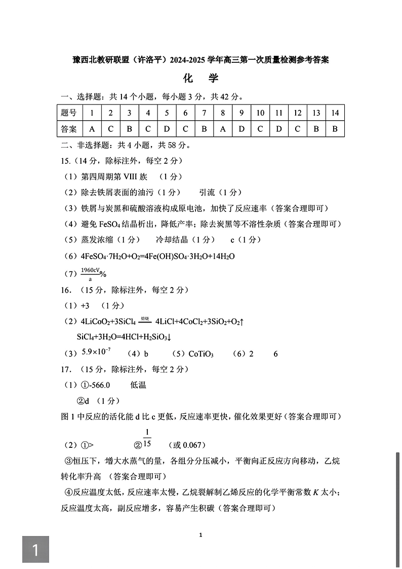 河南省豫西北教研联盟2025届高三上学期第一次质量检测化学答案