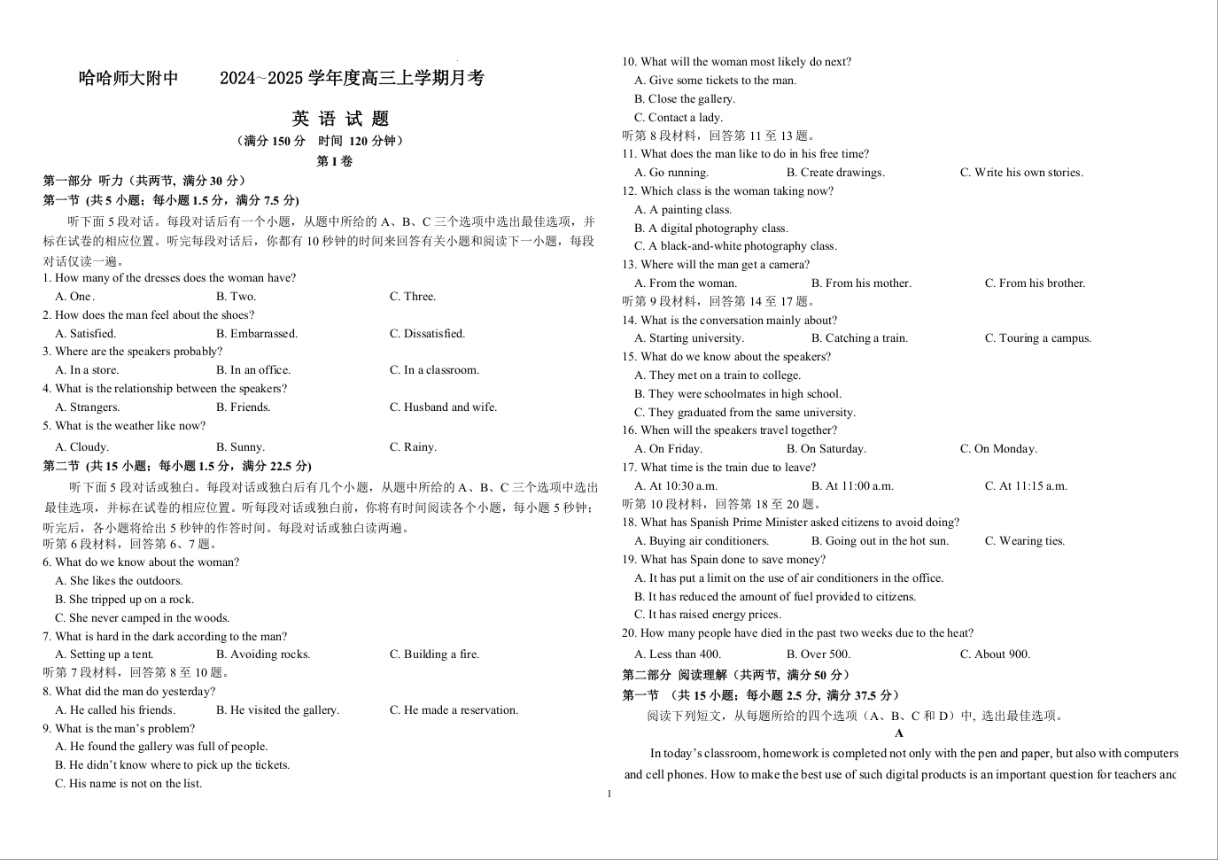 黑龙江省哈尔滨师范大学附属中学2025届高三上学期10月月考英语