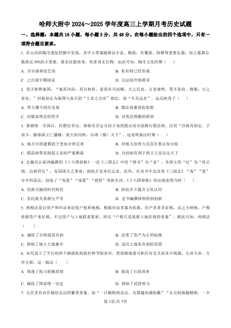 黑龙江省哈尔滨师范大学附属中学2025届高三上学期10月月考(原卷版)